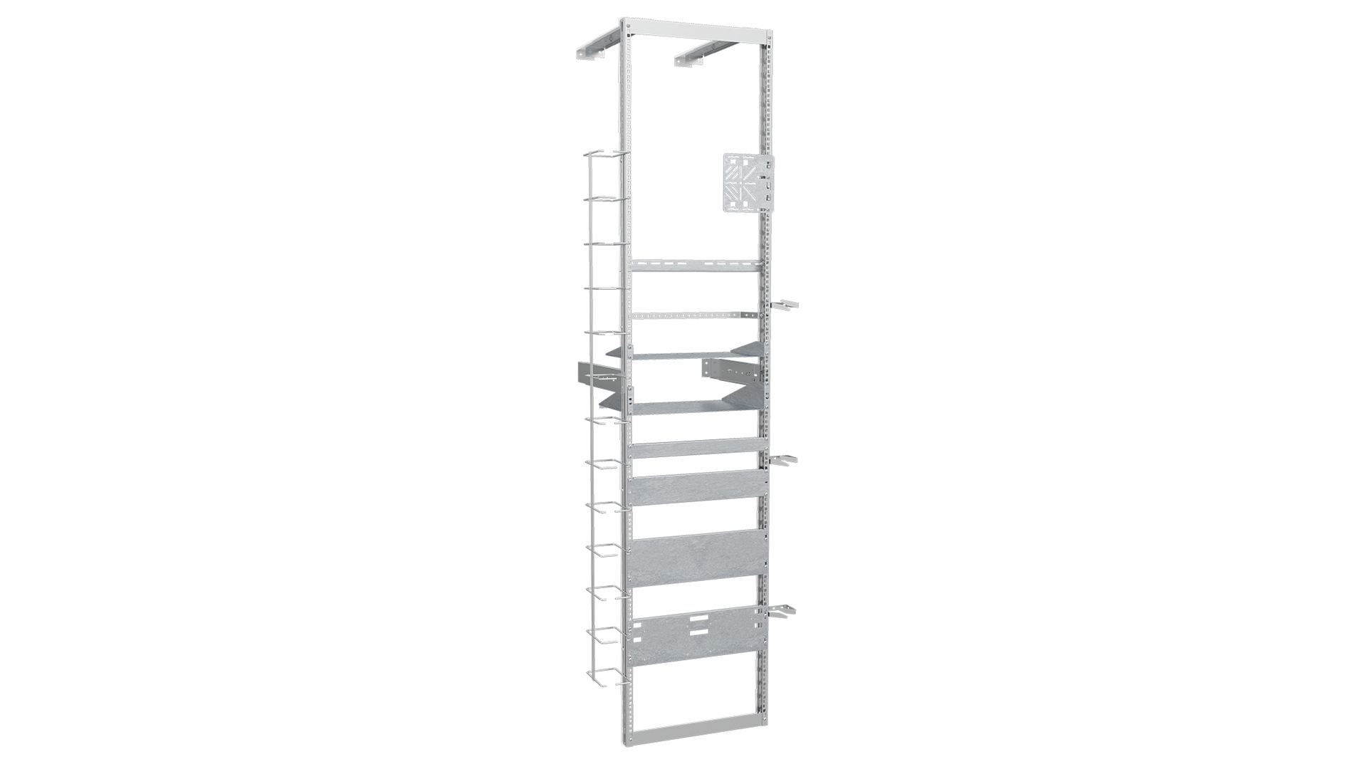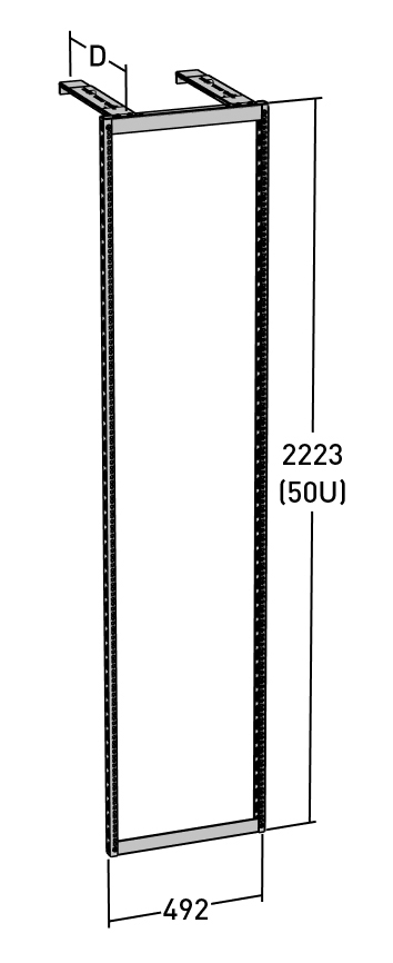 Golvstativ med justerbart väggavstånd 350 -600 mm - elförzinkat. MP-19" stativ är en monteringssats som har två standarder i samma stativ, data på ena sidan enligt SS-EN 60297-3-100 med hål för korgmutter M6. Tele på andra sidan enligt g:a SEN R 430115, med hål 6,5 x 31,75 mm för M6-skruv. Höjden är 50 Units (44,45 mm) varav 48 är användbara.