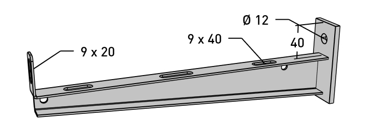 Väggkonsol för montage av kabelstegar, trådstegar, kabelrännor m.m mot vägg eller på en sidopendel från tak.Tillverkad av varmförzinkad plåt (55 µm) och är användbar i miljöklass max C4. Fixering på konsolen görs med monteringsskruv i framkanten och universalbricka MP-731 samt skruv i bakkant vid behov. Vid porösa väggar kan underläggsplåt användas.Brottlast: = 1,7 ggr maxlast.