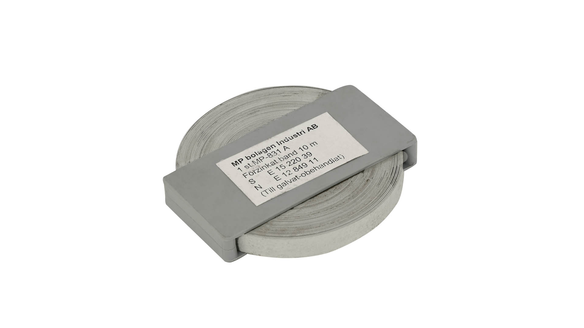 Stålband 10x0,5 mm med gradade kanter. Brottgräns 600N/mm² ± 100 N. Bandet (10 m) är upprullat i en plastkassett där änden göms i kassetten för att inte haka fast i omgivande föremål. OBS! Vid anslutning kring obehandlat rör använd aluzinkat band.